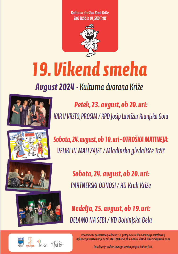 KD Kruh Križe ob pomoči ZKO Tržič, OI JSKD Tržič ter Občine Tržič vabi na že 19. Vikend smeha, tradicionalni poletni mini-festival ljubiteljskega gledališča. Med petkom, 23., in nedeljo, 25. avgustom 2024, se bodo v kriški kulturni dvorani zvrstile štiri predstave (tri za odrasle ter ena za otroke).